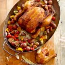 Transfer the chickens to a carving board, cover loosely with aluminum foil and let rest for 10 minutes. Transfer the potatoes and peppers to a platter. Carve the chickens, arrange on the platter and serve immediately. Serves 8.