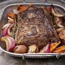 Place the roast, fat side down, in the pan and sear until well browned, 1 1/2 to 2 minutes. Turn the roast over and sear for 1 1/2 to 2 minutes more. Turn off the center burners and reduce the outside burners to medium-high. Place the vegetables along the sides of the pan and lay the rosemary sprigs on top.