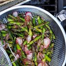 Grilling the asparagus in a mesh pan imparts a subtly smoky flavor to this warm spring salad while preventing you from losing any food to the fire.