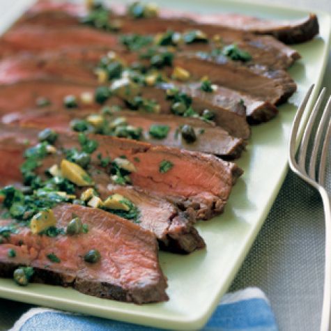 Italy is known for some memorable beef dishes, including bollito misto, a Piedmontese classic of boiled meat served with a sharply flavored salsa verde (green sauce). Here, the salsa verde is perfect with thin slices of grilled flank steak. Green olives add a pleasant savory note. Flank steak is one of the cuts of beef that is lowest in fat. Because it is fibrous, it can be tough. Be careful not to overcook it, and cut it across the grain into thin slices.