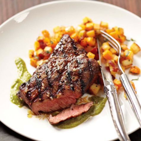 Grilled Flat-Iron Steak with Chimichurri and Butternut Squash and Rutabaga Hash
