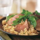 Add the lemon juice to the couscous. Taste and adjust the seasonings with salt and pepper, then fluff with a fork. Spoon the couscous onto individual plates and surround with the salad greens. Top with the lamb and serve immediately. Serves 4.