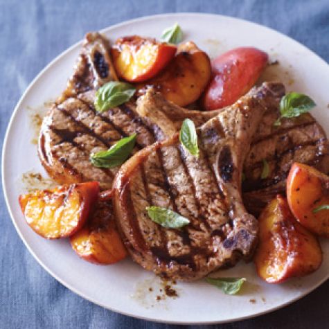 Grilled Pork Chops with Caramelized Peaches and Basil