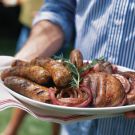 While the vegetables and rolls are on the grill, cut the sausages on the diagonal into thirds, capturing any carving juices, if possible. Arrange the sausage pieces on a warmed platter and drizzle with the carving juices. Arrange the mushrooms and onions alongside the sausages or on another warmed platter and garnish with rosemary sprigs. Serve immediately with the ciabatta rolls and condiments. Serves 10.