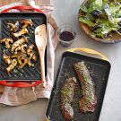 Heat a cast-iron skinny griddle over medium-high heat until hot. Season the skirt steak generously with salt and pepper. Brush the griddle with 1 Tbs. of the olive oil. Place the steak on the griddle and cook, turning once, until well seared on both sides, 3 to 4 minutes per side for medium-rare, or until done to your liking. Transfer to a cutting board and let rest for 5 minutes.