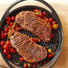 A medley of spices lends a subtle smoky flavor to New York strip steaks, which are cooked to juicy perfection on a cast-iron grill pan. Finish the dish with cherry tomatoes and fresh basil.