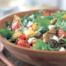 Cut the grilled vegetables into bite-size pieces and add to the vinaigrette. Add the tomatoes and greens. Toss to coat well, sprinkle with the cheese and serve. Serves 4.