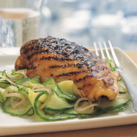 Remove the chicken from the marinade, shaking off the excess, and discard the marinade. Place the chicken, skin side up, on the grill rack and grill until browned, 7 to 8 minutes. Using tongs, turn and grill on the skin side until browned, 5 to 7 minutes more. Move the chicken away from the direct heat, cover the grill and continue to cook until opaque or an instant-read thermometer inserted into the thickest part away from bone registers 160°F, 7 to 10 minutes. Serve the chicken with the cucumber salad. Serves 4.