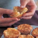 Fill the prepared muffin cups to within about 1/4 inch of the rims. Place 1 scant tsp. grated cheese in the center of each filled cup. Bake, without opening the oven door, for 10 minutes. Reduce the oven temperature to 350°F and bake until the popovers are brown, crusty and fully puffed, 8 to 10 minutes longer.