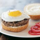 In this version of “eggs on horseback,” fried eggs top grilled hamburgers. The soft egg yolk in each sandwich breaks and seeps into the beef, making a heavenly combination of tastes and textures. Serve with Potatoes Lyonnaise, simple fried potatoes or seasoned tomatoes for a special morning treat.