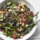 As soon as the air gets crisp and the days become shorter, Chef Bobby Flay craves this salad. Asian pears, dried cranberries, wild rice and walnuts come together and just scream “fall.” Deep green kale is a gorgeous base for the ruby fruit and lightly golden nuts. Look for Tuscan kale, which is also known as lacinato kale, dino kale and cavolo nero.