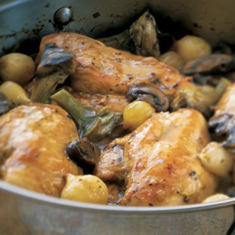 Return the chicken to the pot and pour in the remaining 1 cup wine and the broth. Cover, reduce the heat to medium-low and simmer until the chicken is very tender, 1 to 1 1/4 hours. Add the artichokes to the pot and cook until heated through, about 5 minutes. Season with the salt and pepper. Remove from the heat, garnish with parsley and serve. Serves 4.