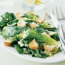 Hearts of romaine, the small, paler yellow leaves in the center of the large heads, are crunchy and tender, with a distinctive flavor that stands up well to assertive flavors, such as the blue cheese in the dressing and the garlic in the croutons here. Escarole and frisée, lightly bitter members of the chicory family, can be substituted for the romaine.