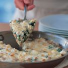 In a heavy 10-inch ovenproof fry pan over medium heat, warm the olive oil. Add the onion and sauté until just softened, 3 to 4 minutes. Add the garlic, spinach and bell pepper and cook, stirring, until the spinach wilts, 1 to 2 minutes.