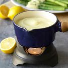 Using a stick blender with the aerator attachment, blend the mixture while slowly pouring in the melted butter in a thin stream until incorporated, about 2 minutes. Taste and adjust the seasonings. Cover and keep warm over very low heat, or transfer to a cast-iron sauce warmer until ready to serve.