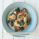 Though easy to assemble, this simple braise has a complex combination of sweet, salty, bitter and spicy flavors. If you like lots of greens, you can add a second bunch of Tuscan kale (also known as lacinato or dino kale), but you will need to stir it three or four times as it cooks. Serve over soba or other Asian noodles and top with a sprinkle of toasted sesame seeds.