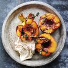 Bake until the peach juices collect in the hollows where the pits were removed, about 15 minutes. Remove from the oven. Brush the peaches with the honey, letting the juices run into the baking dish. Return to the oven and bake until the peaches are tender, about 5 minutes more. Serve the peaches immediately, with the cooking juices spooned on top, and top with the mascarpone and thyme. Serves 4 to 6.