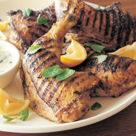 Transfer the chicken to a warmed platter and let rest for 5 minutes. Sprinkle with mint leaves and serve immediately. Pass the raita and lemon wedges at the table. Serves 4.