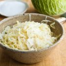 Feather a few handfuls of the cabbage into the crock, alternately sprinkling in the salt between handfuls.