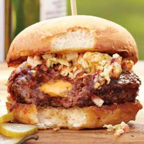 A sweet, tangy and smoky KC barbecue sauce plus chopped coleslaw lend a Midwestern flair to these burgers, which are each stuffed with a slice of American cheese.