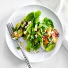 Layer whole lettuce leaves across the bottom of a wide salad bowl or a medium platter with a lip. Top with the beans, tomatoes, cheese and then the bacon. Drizzle with the reserved bacon fat, olive oil and vinegar. Top with the basil, parsley, salt and pepper. Let sit for 10 to 15 minutes before serving, but no more. If making ahead, place the undressed salad in the refrigerator. Drizzle with the bacon fat, oil and vinegar just before serving. Serves 4 to 6.