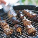 Lightly oil the grill rack. Remove the beef from the marinade and dip the mushrooms into the marinade. Thread beef cubes and mushrooms onto each skewer. Place the skewers on the grill and cook, turning occasionally, about 10 minutes total for medium-rare. Transfer to individual plates or a platter and serve immediately. Serves 4.