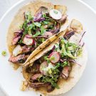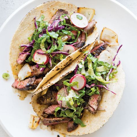 To assemble, fill the tortillas with the beef, top with a few big pinches of the slaw and some grilled white onion, and serve immediately. Pass the extra sriracha cream at the table for drizzling. Serves 6.