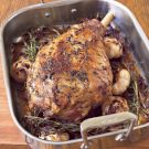 Arrange the rosemary in the center of the pan. Place the lamb, fat side up, on top. Arrange the garlic heads around the lamb. Roast until an instant-read thermometer inserted into the thickest part of the meat, away from the bone, registers 130°F for medium-rare, about 1 hour. Transfer the lamb to a carving board, cover loosely with aluminum foil and let rest for 20 minutes.