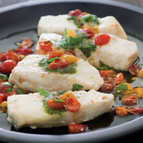 • Seared Halibut in Dashi Broth with Crispy Shallots, Ginger and Garlic