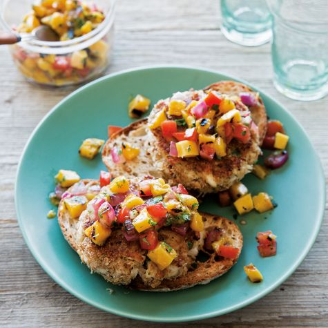 • Crab and Jalapeño Burgers with Grilled Mango Salsa