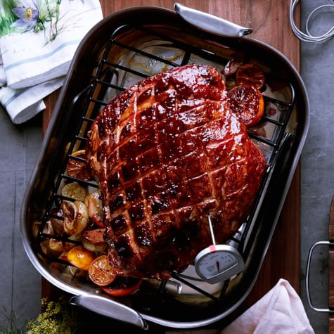 Transfer the ham to a carving board and let rest for 10 to 15 minutes. Cut the ham into slices and arrange on a warmed platter. Serves 12 to 14.