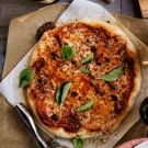 The classic Margherita pizza gets a flavor boost from our ready-to-use sauce, which is seasoned with fiery ghost chiles. The recipe was created for the Breville pizza maker. To bake the pizza in a standard oven, place a pizza stone in the oven and preheat the oven to 500°F (260°C). Roll out the dough as directed below, but don’t prick it with a fork. Add the toppings and bake on the pizza stone for 10 to 12 minutes.