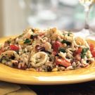 Add the rice to the squid mixture along with the currants, pine nuts, tomatoes and mint. Toss to distribute the ingredients evenly, then taste and adjust the seasonings with salt and pepper. Serve immediately, or cover tightly and refrigerate for up to 1 day, then bring to room temperature before serving. Serves 4 to 6.