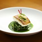 Here, halibut fillets are cooked sous vide with milk, fresh rosemary and makrut lime leaves, which are commonly used in Southeast Asian cooking.