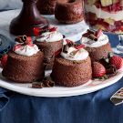 Invert the pan onto the necks of 2 wine bottles set over a wire rack and let cool upside down for about 20 minutes. Run a paring knife around the edges of the wells to release the cakes, then turn the cakes out onto the rack. Let cool on the rack for about 10 minutes more. Top the cakes with whipped cream, strawberries and shaved chocolate and serve immediately. Serves 6.