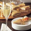 Cut the crusts off the sandwiches. Cut each sandwich diagonally and then diagonally again, forming 4 triangles. Transfer to a platter and serve immediately. Makes 24 hors d'oeuvres.