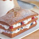 Using a large, thin-bladed serrated knife, cut the cake horizontally into 3 equal layers. Place the bottom cake layer on a serving plate and, using an icing spatula, spread with half of the whipped cream with berries. Place the middle cake layer on top of the cream and spread with the remaining half of the whipped cream. Top with the final cake layer. Refrigerate for at least 2 hours or up to 5 hours.