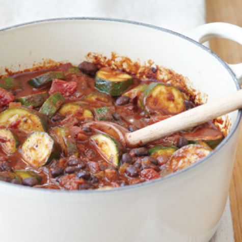 Add the black beans and simmer until the zucchini is tender and the flavors have blended, thinning the chili with water if it is too thick, about 10 minutes more.