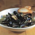 To serve, spoon the mussels into large warmed soup bowls, ladle some of the broth over them, and sprinkle with the remaining 1 Tbs. parsley. Serve immediately, with baguette slices for dipping in the broth.