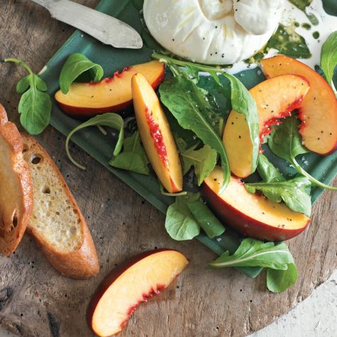 Creamy burrata cheese meets sweet nectarines in this summer-fresh starter that takes just minutes to assemble. Let guests help themselves, layering the ingredients on crusty bread.