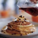 To serve, put the walnuts, bananas and currants in separate small serving bowls. Pour the maple syrup into a warmed pitcher. Cut the cinnamon butter into slices 1/4 inch thick and arrange on a small plate or saucer. Place all the toppings on the table. Transfer the pancakes to a warmed platter and place on the table. Let guest build and top their own stack of pancakes. Serves 6.