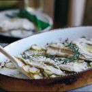 Remove the dish from the oven and arrange the fish in a single layer on top of the potatoes. Drizzle with the remaining 1 Tbs. olive oil and sprinkle with the remaining garlic mixture. Lay the rosemary sprig on top. Return to the oven and bake until the fillets are opaque throughout, about 10 minutes. Remove from the oven and let rest for 10 minutes before serving directly from the baking dish.