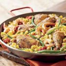 Paella takes its name from the two-handled shallow pan, called a paellera, in which it is customarily cooked. The dish originated in Valencia, Spain, where it is typically made with a medium-grain rice, rabbit or chicken, tomatoes, beans and often snails. In this recipe, the snails are replaced with shrimp.