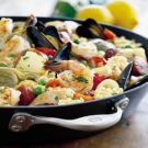 Originating in Spain's Valencia region, paella is a dish of saffron-infused rice cooked with various meats, seafood and vegetables. It is traditionally made with a Spanish short-grain rice; the best comes from Calasparra and is called Bomba. The dish is prepared and served in a large, round, shallow pan.