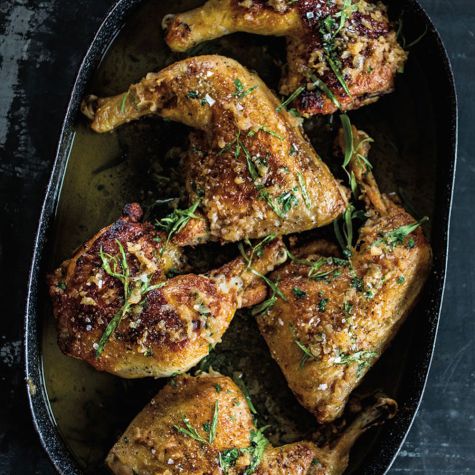 Starting a dish on the stove top and then finishing in the oven is ideal for the dark meat of chicken legs. Parsley, tarragon, shallot and white wine combine to create this bright-tasting pan sauce.