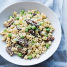 This dish features many small elements, each bursting with health benefits. Dainty English peas should be kept in their shells until just before cooking time to retain freshness and vitamins. If meaty morels are not available, substitute cremini or shiitake mushrooms—all three varieties are equally potent in cancer-fighting selenium. Aromatic basil and a light dusting of Parmigiano-Reggiano complete this spring meal.