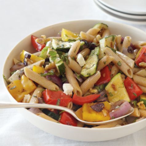 This meatless pasta dish shows that if you start with fresh ingredients, it takes very little work to make a stellar meal. Olives and feta cheese add richness and walnuts add crunch, but you can omit any of these if you wish.