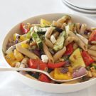 Drain the pasta and transfer to a warmed shallow serving bowl. Add the grilled vegetables, extra-virgin olive oil, mixed fresh herbs, chili, olives and walnuts and toss to combine. Season with salt and pepper. If using feta cheese, sprinkle it over the pasta and toss to combine. If using Romano cheese, allow diners to grate it over their own serving at the table. Serves 4.
