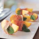 Place a mint leaf on each peach wedge and wrap with a strip of prosciutto. If desired, secure with a toothpick. Transfer to a platter and serve. Makes 24 pieces.