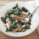 Bring a large pot three-fourths full of salted water to a boil over high heat. Add the kale or other greens and boil until the greens are just tender, 30 seconds to 6 minutes, depending on the variety of greens. Using a skimmer or a slotted spoon, transfer the greens to a colander and drain. Return the water in the pot to a boil, add the pasta, stir well and cook until al dente (tender but firm to the bite), about 10 minutes.